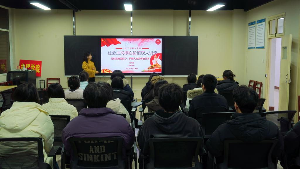 为深入贯彻落实党的二十大及历次全会精神,将社会主义核心价值观深度融入专业育人全过程,2025年12月30日晚,护理学院在A14-215会议室举办2025年度社会主义核心价值观主题大讲堂。本次讲座以“最有温度的匠心:护理人文关怀的艺术”为题,由我院周筱鑫老师主讲。学院学工办主任闫泽雨、分团委书记许振山及学生代表出席会议。